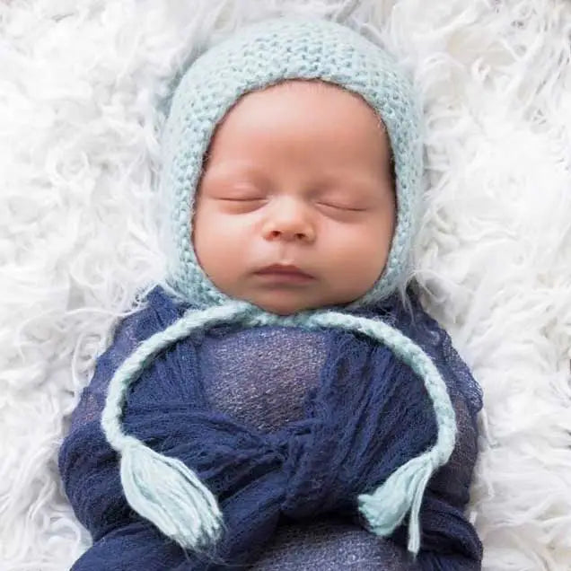 A stunning hand-knit bonnet in the softest angora acrylic yarn has tassel ties. It is a great hospital hat for coming home, perfect for first portraits and makes a great baby shower or hospital gift. Sized just for newborns. Fits most newborns 6-9 pounds. 100% acrylic. Cold handwash