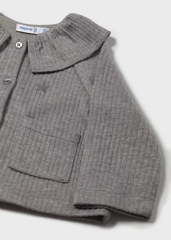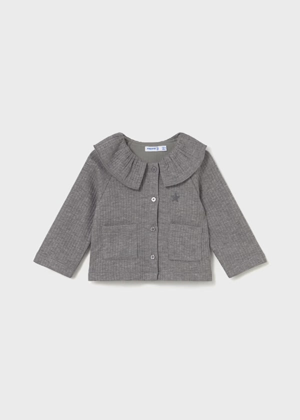 Long sleeved Jacket for baby. Round neckline with ruffles. Button fastenings down the front. Combination of different fabrics to achieve a unique and special design. Functional front pockets. Decorative elements: embroidery.