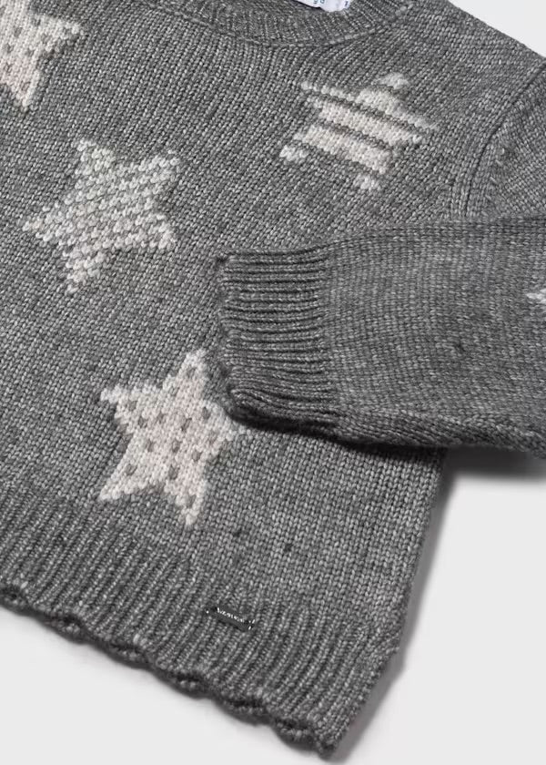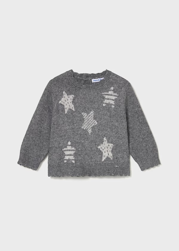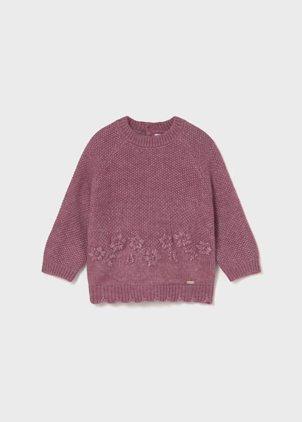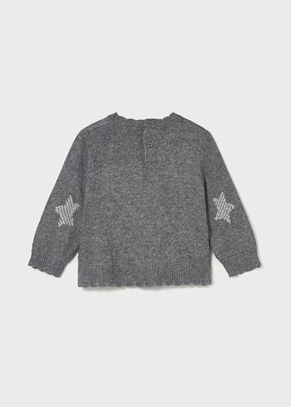 Long sleeved Sweater for baby. Waved collar. Button fastenings down the back to allow the garment to be put on and taken off easily. Combination of different fabrics to achieve a unique and special design. Decorative elements: decorative designs.