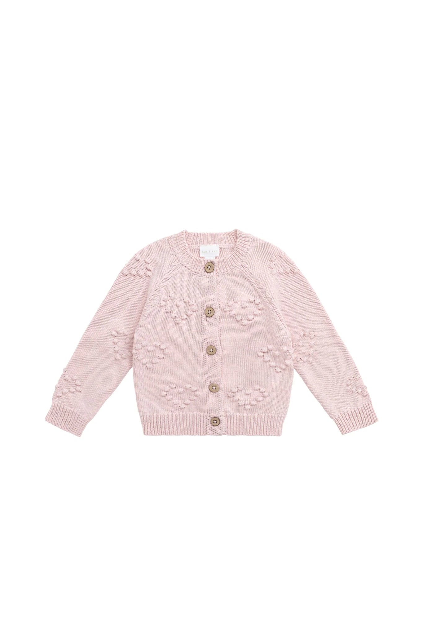 Add a touch of sweetness to your little one’s wardrobe with the Gracie Cardigan in Trinket - a beautifully knitted piece adorned with delicate heart designs. This soft pink cardigan offers a gentle pop of colour and a playful yet timeless look, perfect for layering across seasons.